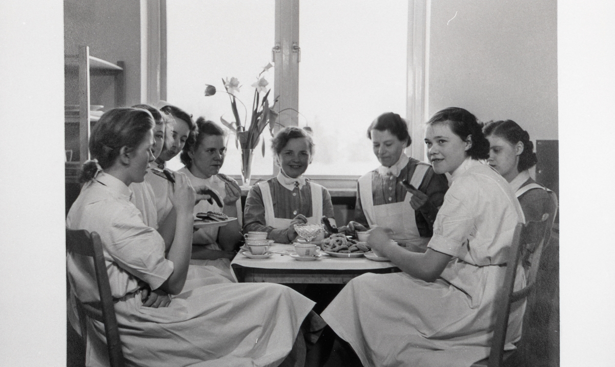 Systrarna Viviann och Saga med sina medhjälpare. Från utställningen "Falköping i bild" 1952.