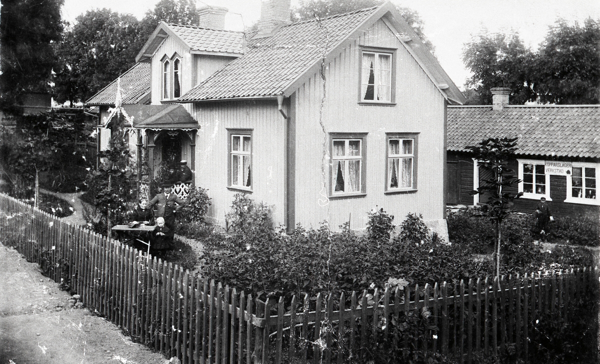På verandan: t.h. C.G. Dahlstrand. Vid bordet Ernst Albin Pettersson med fru och sonen Gillis. Utanför verkstaden kopparslagaren Julius Berggren. Omkring år 1900.