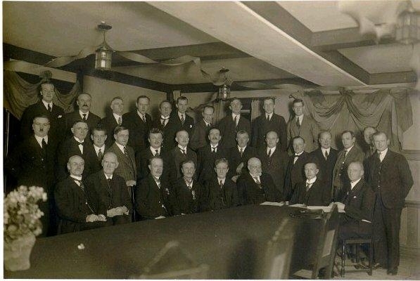 Hantverksföreningen. Borgmästare Sigurd Koch överlämnar medaljer till medlemmar 1931. Rad 1. från vänster: Köpman Anders Gustaf Liedholm, fabrikör Charles Andersson, medaljörer Johansson och Svensson, plåtslagarmästare Medin, borgmästare Sigurd Kock, skomakare Karl Rydell, slöjdlärare Gustav Andersson. Rad 2. Målare Hjalmar Karlsson, plåtslagare Johansson, urmakare Westerstrand, skräddare Erik Sam. Jonsson, överl. Hilding Svensson, rektor Harald Wagnér, Ludvig Blomkvist, sotare Danielsson, frisör Gustav Johansson, möbelsnickare Thorsson, bagare Gunnar Blomgren, urmakare Algot Karlsson, målare Rosell. Rad 3. Guldsmed Nils Blom, byggmästare Klas Stenberg, övermontör Albin Persson, snickarmäst. ?, verkmästare på Aristo Helge Johansson, guldsmed Daniel Ekström, plåtslagare Erik Medin, skräddare Karén, trädgårdsmästare Arvid Jansson.