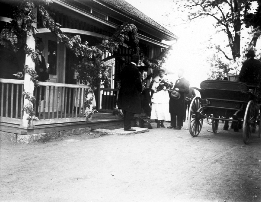 Komministergården Floby. Paul Melin med fru välkomnas av kyrkoherde Klas Lindholm.