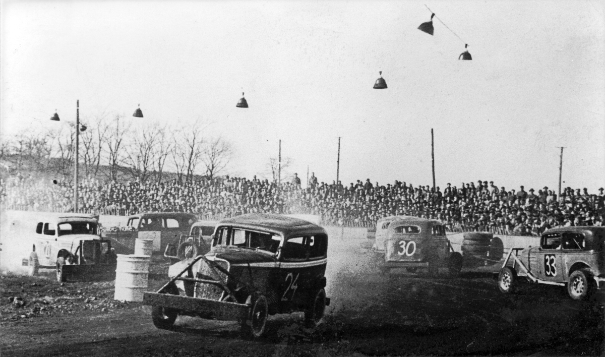 Premiärtävling, Stock car, 24/4 1955, Falköpings motorbana. Här leder bil 4 (Lars Bjurde, Göteborg). N:r 34 är Enok Stennert, Stenstop i en Ford 1937.