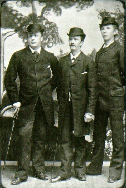 En trio vänner. Från vänster: C.H. Gustafsson, då föreståndare för Bryntessons Spannmålsaffär, Joh.Jansson, bokförare i Bollnäs, död där 9/11 1933. Vid kortets tagande biträde hos S.Jacobson, Vartofta, Emil Thorsell, död i Hjo för över 4 år sedan, vid kortets tagande biträde hos J.Janzon, Falköping.