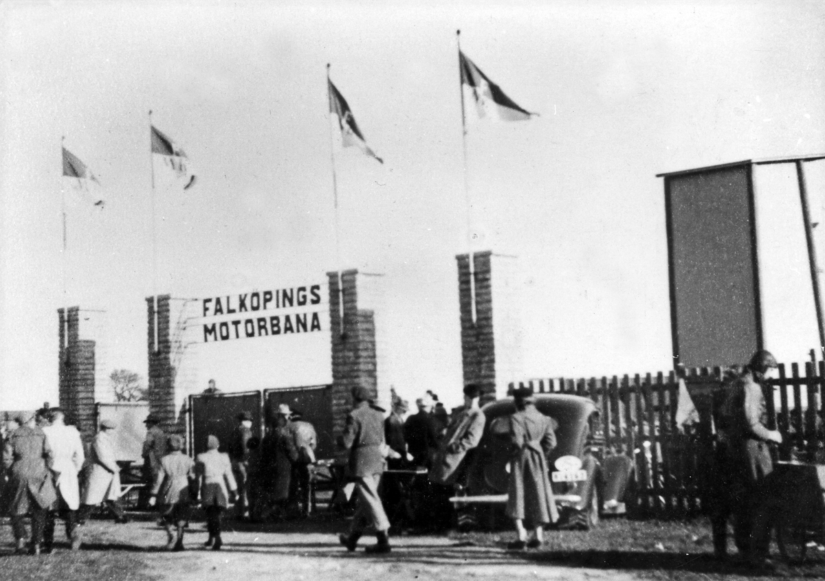 Falköpings motorbana. Den pampiga entrén med fyra kalkstenspelare. Volvon tillhör klubbens ekonomichef Johan Millqvist. Korvförsäljaren är Halvdan Andersson. Okänt år.
