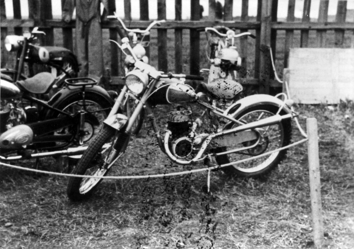 Visning av nya motorcyklar i samband med Falköpingsutställningen 1951. T.v. en Sparta med Willers 200 cc motor, och en Apollo med 120 cc Hva motor, 1951 års modeller.