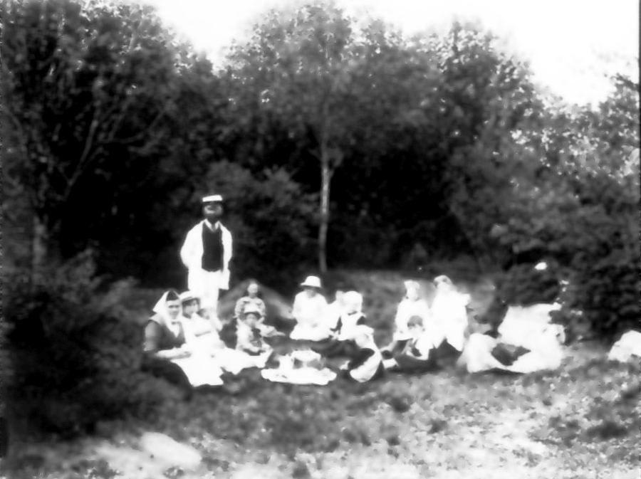 På kullen på Alphem. Frans Johan Gegerfeldt. Sittande Manda G, Hildur Jonsson med Åke Nilsson i knät, Karl och Ingegerd G, okänd, Gertrud Nilsson med sönerna Karl och Stig, Astrid G, okänd, Inga Samuelsson.