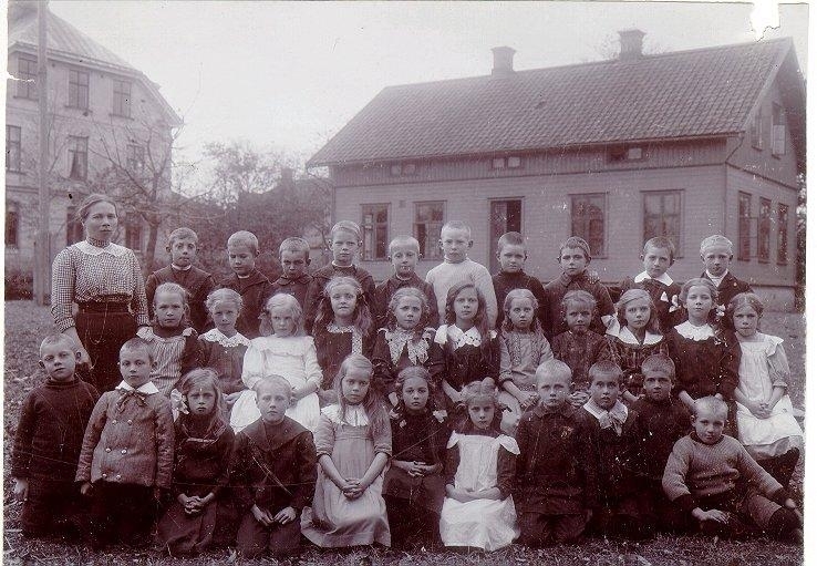 Folkskolan. Lärarinnan Emma Larssons skolklass 1911-1912 utanför Rantens småskola, nuv. ABF:s lokal, S:t Olofsgatan 50. Översta raden fr.v. 1. Knut Rudh, 2. Allan Lind (Erik Pettersson),3. Knut Hedström, 4. Erik Palmén (Herbert Pallman), 5. Allan Setterberg (Allan Lind), 6. Martin Karlsson 7. Gösta Alexandersson, 8. Karl Ahlin, 9. Sven Johansson, 10. Gillis Borg. Mellersta raden: 1. Tyra Gustafsson, gift Lindgren, 2. Mary Evertz, 3. Hanna Karlsson - syster till Martin Karlsson, 4. Greta Sandström, 5. Berta Nylén, gift med Erik Nygren, 6. Vega Karlsson, 7. Greta Finn, 8, Ingeborg Käck, 9. Effy Setterberg, gift med John Liedholm, 10. Elsy Malmberg, 11. Gunhild Svensson, gift Andersson. Nedre raden: 1. Sven Alfridsson - typograf i Skövde, 2. Jonas Johansson, 3. Elin Karlsson, 4. Knut Boman, 5. Stina Hallén, 6. Ingrid Rönngren, 7. Ragnhild Jonson, gift Bergsten, 8. Frank Leijon, 9. Henrik Gustafsson, 10. Erik Henriksson, 11. Tage Roslund. Gåva fr. Emma Larsson, Falköping 1954. Namnuppgifter efter anteckningar. In