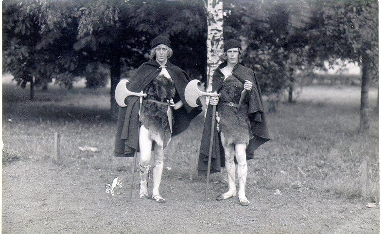 Kulturhistoriska festtåget och festspelen i Falköping den 5 augusti 1934. Bronsåldersmän, klädda i mantlar, som förfärdigats med den ryktbara Gerumsmanteln som förebild, de bär dolkar i bältet samt yxor, vilka är avgjutningar av processionsyxor från bronsåldern.