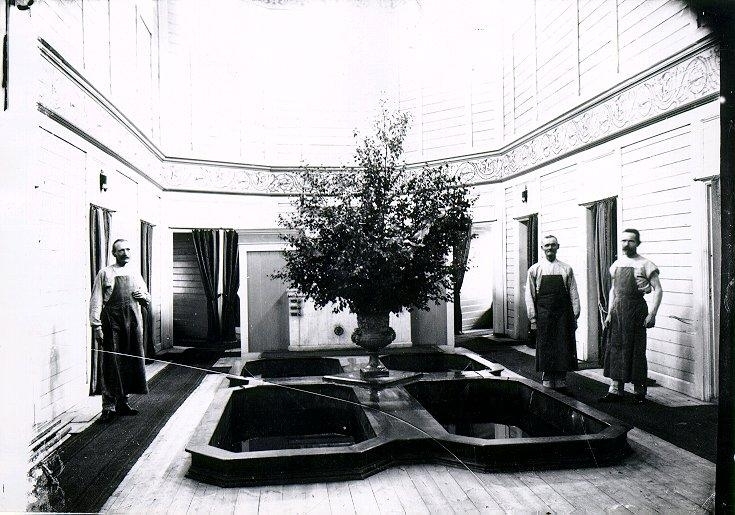 Mössebergs badanstalt. Badarna. 1:a klass. På baksidan av kortet står antecknat att den är från 1884 och att prosten Emil Boström i Gudhem är på Mösseberg tillsammans med en syster, Anna Boström - Bergman.