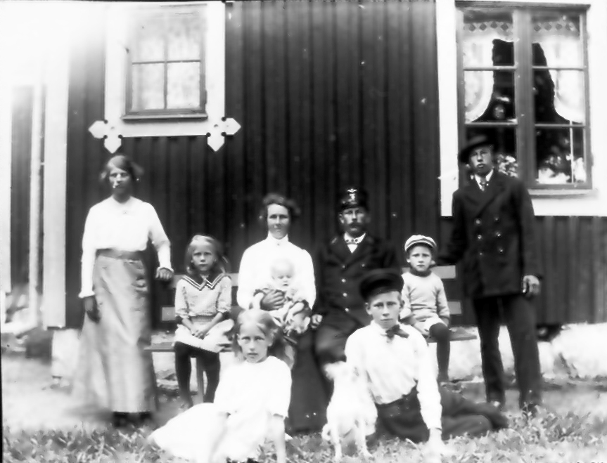 Banvaktstuga n:r 80 mellan Väla och Källeryd. Huset revs och byggdes upp på Alphem. Banvakt Hjalmar Blomgren med hustrun Hilda och barnen Anna-Britta (i knät), Ester, Göta, Asta, Bertil, Allan och Hilding.