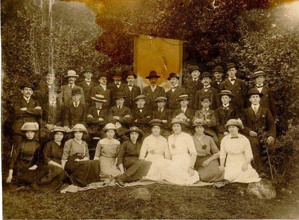 Verdandi nykterhetsloge. Övre raden från vänster: 1. Hjalmar Dahl, 2. Lindahl, 3 - 4 okända, 5. Hans Karlsson, 6. Gustav Lager, 7. E Söderberg, 8. Johannes Hellkvist, 9. Manne Johansson, 10. Mårten Ung, 11. A. Josefsson, 12. Axel Ljungkvist, 13. okänd. Andra raden: 1. Johansson, 2. okänd, 3. Anders Lindstedt, 4. Högberg, 5. Svärd, 6. Svensson, 7. I. Lind, 8. Gillis Rydberg, 9. Rickard Johansson, 10. Andersson (Knutten), 11. I. Johansson. Nedre raden: 1. Lundin, 2. okänd, 3. Fru Söderberg, 4 - 5 okända, 6. Anna Snäll, 7. Alma Karlsson, 8. Ann Persson. Medlemmarna tillhörde Socialdemokratiska Nykterhetsförbundet.