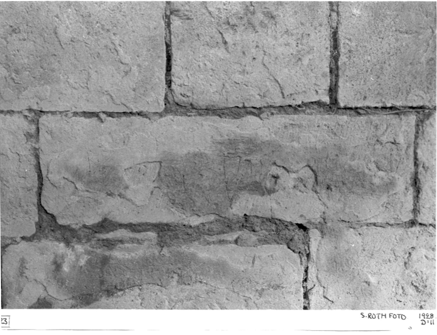 Södra koret. Norra muren. Andra stenen väster om öppningen till mittkoret i andra skiftet från kälskiftet (se foto 22) med i putsen före finslipningen inristade bokstavstecken (R LU).