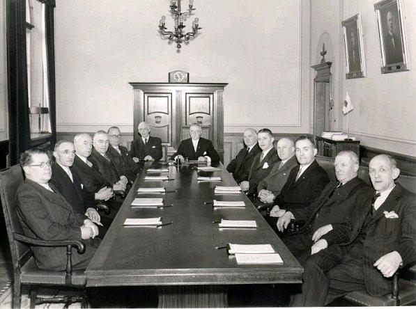 Sparbankens sessionsrum, styrelsesammanträde Fr. vänster: Erik Hagman, Hjalmar Pettersson, Titus Haglund, Hjalmar Karlsson, Enoc Carlsson, Karl Edvard Lindström, Einar Magnusson, K.A. Johansson, Kurt Larsson-Grip, Paul Lundin, Einar Setterberg, Karl Larsson och Oskar V. Johansson.