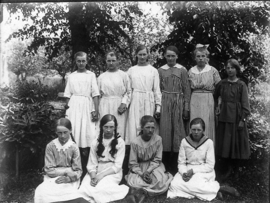 Läsflickor 1920. Främre raden Elin Sköld, Astrid Öst, Elsa Lundkvist, Astrid Samuelsson. Bakre raden Anna Fredriksson, Edla Freiman, Sigrid Båge, Ella Bäckström Björnros, Anna Alexandersson och Ester Johansson-Hägg.