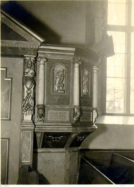 Predikstolen i S:t Olofs kyrka. Predikstolen i vår kyrka är utförd i barock och skänkt till kyrkan någon gång i mitten av 1600-talet. Den skänktes av befallningsmannen i Gudhems, Vilske och Valle härader, borgmästaren i Falköping Lars Andersson-Hvass, som ligger begraven i södra korsgången. Han var född 1611 och dog 1660. I den likpredikan över honom av broddetorpskyrkoherden Elavus Elavi, som hölls i kyrkan vid begravningen, står bl.a.att läsa: " Han haver guds boning kär och det rum där hans ära bor.- - - - Det haver han besynnerliga låtit se med denna stadens kyrka, som var nästan taklös när han kom hit. - - - Desslikes med en kostelig inreda , med en kostelig predikstol, altartavla, mässekläder avdelat kor och vackre inbyggde stolar som en stadskyrka väl pryda" - - - - - -