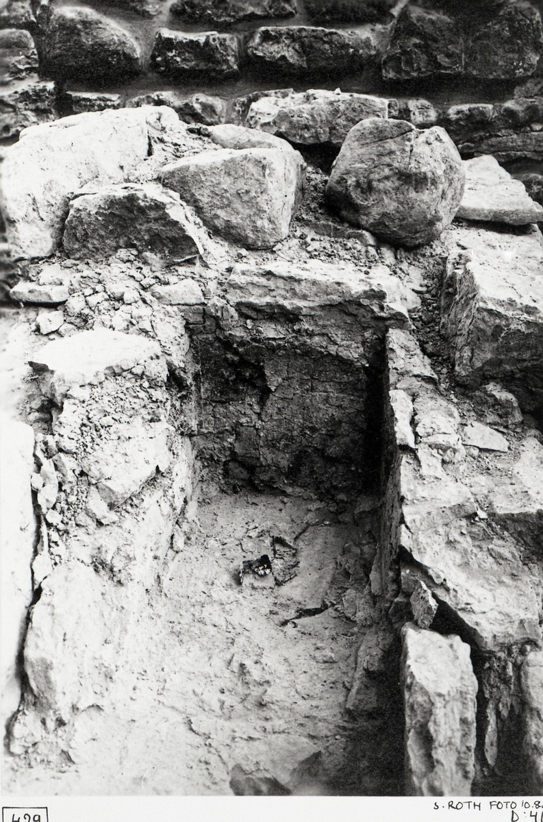 Norra sidoskeppet. Altaret i västra delen, sett från söder, sedan fyllningen borttagits. Obs. avtryck efter järnbeslag i högra hörnet (se pilen). Löst järnbeslag på nischens botten.