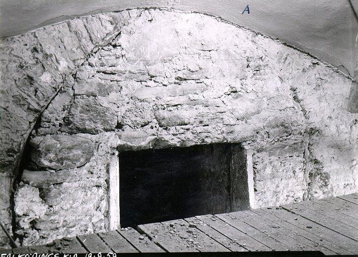 S:t Olofs kyrka. Restaureringen 1958-1961. Långhuset. Västra väggens insida. Murfogar efter ett igenmurat fönster, övre delen (bågen). A= valvkappa. Foto fr. sydost.
