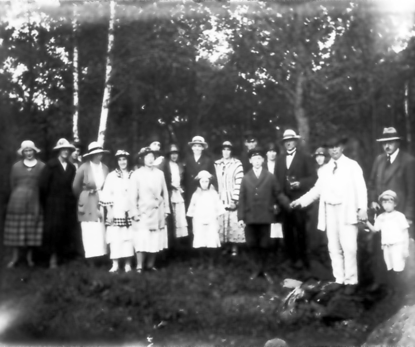 Trävattna kyrkliga ungdomskrets på utflykt till Järnkällan i Gisslared. Tyra Olsson-Persson, Ellen Öhrnell, okänd, Elin Karlsson-Johansson, Berta Johansson, Linnea Larsson, okänd, Berta Olsson, lärarinnan Gerda Glansén, Alice Andersson-Medin, Hilda Johansson, okänd, Arne Sjöberg, Hedvig Andersson, Herman Johansson, Märta Lindholm, Åke Lindholm, Verner Kilander.