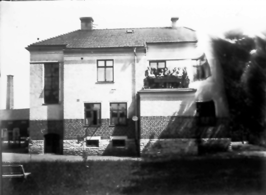 Baksidan av Skaraborgsbankens hus. På balkongen samma personer som på bild 28-6. Gamla mejeriets skorten i bakgrunden. (bilden skadad i kanten)