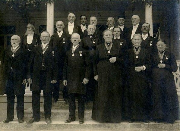 Högtid med medaljutdelning. Främsta raden fr.v. badmästarna Karlsson, Svensson, Moberg, baderskor fr.v. Lotta Svensson och två okända. Mellersta raden fr.v. kapten Stenholm, polisman Lars Johan Fahlrell, apoteksförestånd. Maria Svensson, okänd, kusken Karl Gustafsson. Översta raden fr.v. överläk. dr F. Odenius, underläk. ?, biskop HJ. Danell, patron Lars Ekberg, patron Beckman, Sörbylund, Victor Karlson. Jubileum 4 juli 1917.