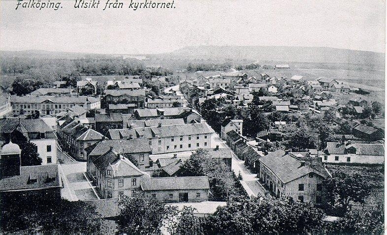 Utsikt från kyrktornet. Nygatan och Ållebergsvägen mot sydost. Till vänster Spritbolagets hus vid Stora torget. Nedtill Rådhusgatan och Rådhuset samt Brandstationen. Foto omkring 1920.