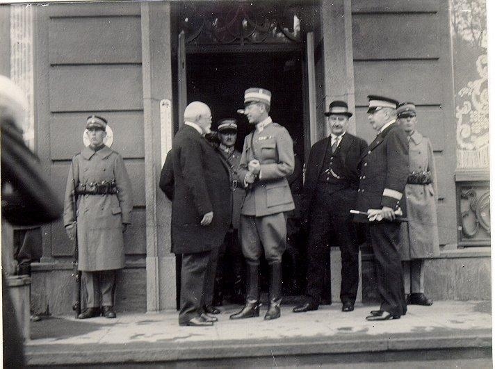 Från fälttjänstövningarna 1931. Kronprinsen och General Boustedt, borgm. S. Koch, statsminister G. Ekman, landshövd. A. Ekman på hotellets trappa. (Skövde?)
