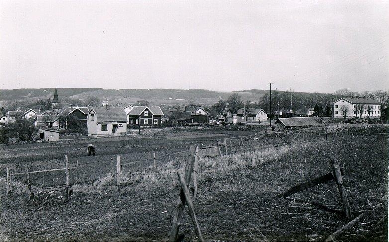 Från Borgmästareparken före bebyggelsen därupppe. Mot kyrkan, Mösseberg med utsiktstornet. Byggnaden nedanför firma SAAB eller Falköpings Bilcity. Bakom byggnaden med brutet tak: Petter Ryttnings väg och Repslagaregatan. Stora vita byggnaden till höger och norr om Ållebergsvägen har varit barnrikehus, nu rivet.