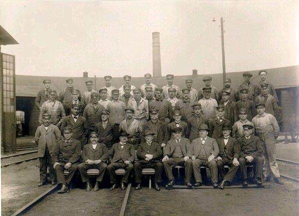 Falköping-Ranten. Personal vid SJ. Övre raden fr.v. : eld. K. J. Skytt, maskinskötare K. Johansson, v.o.st.k. Lindstedt, v.o.st.k. Augustsson, lokrep. K. Wallin, lokrep. sedan i Gbg, v.o.st.k. sen. i Nässjö, e.eld. Andersson, svarvare Holmer, pannsköt. Sv. Kroon, e.v.o.st. Jansson, e.v.st.k. Jansson. 2:a rad. uppifrån: v.o.st.k. Fransson, lokeld. Allan Bergström, lokrep. Lundahl,lokrep. Frizell, v.o.st.k. Engström, v.o.st.k. S. Bergqvist, lokrep. Lundin, lokrep. Jönsson, sedan i Älmhult, v.o.st.k. K. Öberg, lokrep. Jönsson, eld. Ekengren, lokrep. Ljungman, m.o.pannsköt. Eriksson, okänd, v.st. Daag. 3:e raden: st.k. Sjösten, lokeld. A. Nilsson, lokf. A.Th. Brandt, lokrep. A. Ruud, lokrep. Blomén, lokeld. Olsson, sedan i Kristinehamn, ex.lokeld. Nordenstam, v.o.st.k. Sjöblom, lokrep. H. Bengtsson, lokrep. Svensson, sedan i Älmhult. Nedre raden, sittande: lokf. Holmström, lokf. Hindolf, lokmäst. S. Alexandersson, maskining. C.L. Frick, lokmäst. J.G. Danielsson, förrådsförman C. Joh. Olsson, kontorist Axel Lindgr