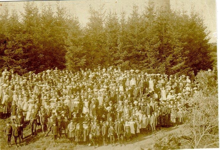 Falköpings folkskolor på utflykt till Mösseberg, under hägn av lärare och lärarinnor: Hallenius, Bohlin, fru Hallenius, fröknarna Josefsson, Andersson, m.fl. (Tornet uppfördes år 1902)