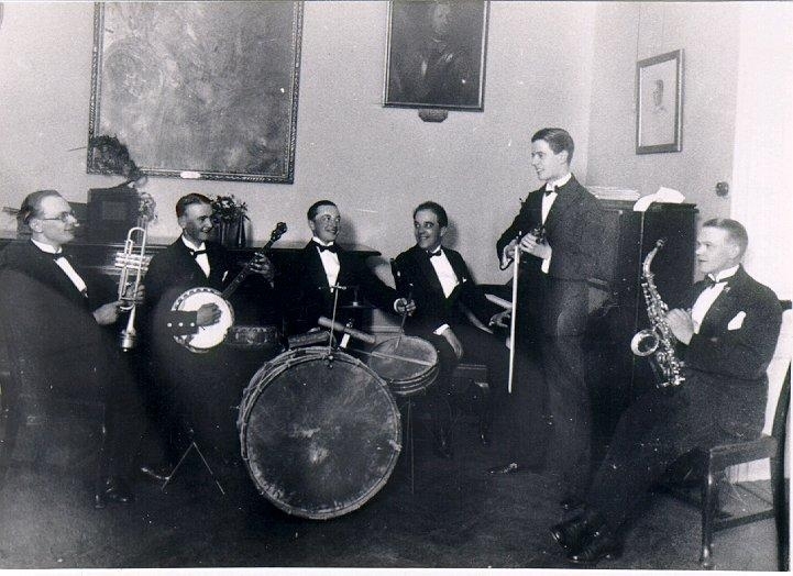 Dansband "Singing Players" omkring 1930. Från vänster: H. Kullberg, Alvar "Putte" Sandberg, Nils Åberg, Gösta Olsson, Lars Halldén, Johannes Andersson.