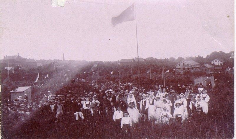 Från Planteringsförbundets sommarfest 1897. I klungan här ovan urskiljs bland annat sedermera borgmästarinnan Tullie Koch, frk. Anna Rehn (senare gift med Paul Elgh), handlare Nils Johansson, fru Forsberg, född Ericsson, kassör J.V. Ander, fröken Edith Anderson, fru Tegnér, född Janzon, kassör Hj. Lundbladh, fru Sigurd Johanson, född Uggla, disponent Oskar Nilsson, veterinär E. Kylén, poliskonstapel Hellström. Brudparet okänt. Det översta vita tornprydda huset i högra övre hörnet är J.A. Forss. Därefter följer hitåt apotekshuset, doktor Neumans (sedan doktor Jungmarkers) snickare Hultings (sedan skrädd.) elektr. Erikssons (sedermera) och till sist häråt under uppbyggnad varande före detta gamla lasarettsbyggnaden "Kalvhagen".