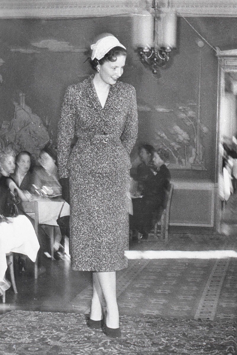 Firma AB N. Ekman. Modekavalkad 1954 i samband med firmans 90-års jubileum. Modevisning Stora hotellet. Bild 3: Kjol och blus våren 1954. Bild 4: Svängd kappa. Skiftande gul och svart bredrandig rips. Våren 1954 Bild 5: Dräkt och kappa årgång 1954. Mellanblå yllerips. Fru Hallgren Bild 6: Eva, Bertil och Marie. Barnbarn till dir. och fru Vilhelm Brandt. Bild 7: Flanschkappa (blåklintsblå). Bild 8: Vårdräkt 1954. Tweed.