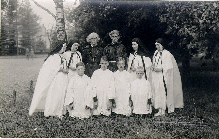 Kulturhistoriska festtåget och festspelen i Falköping den 5 augusti 1934. Klostergrupp, bestående av munkar, nunnor och korgossar. Priorn bär krucifix, den andra munken en vigvattenskål samt nunnorna radband. Korgossarna bär rökelsekar samt vaxljus.
