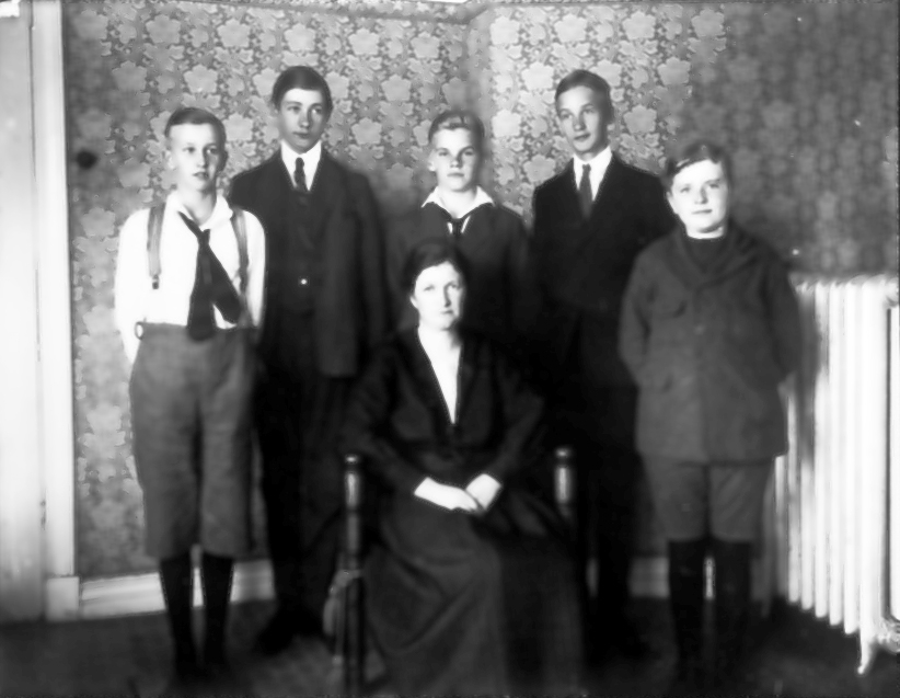 Fru Anna Tengstrand hade i några år inackordering för skolpojkar i samrealskolan i en lägenhet i härnhuset Scheelegatan-Nils Ericsonsgatan. Anna med pojkarna okänd, Karl Nilsson, okänd, Stig Nilsson, Erik Tengstrand.