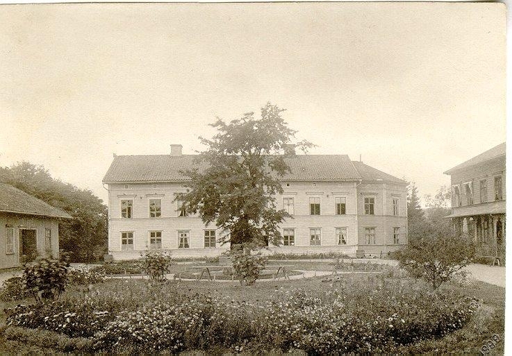 Falköpings första lasarett. Öppnades 15 oktober 1856. Byggnaden flyttades till kv. Byggmästaren, det s.k. Kalvhagen. Helt nytt lasarett invigdes 10 januari 1905. Till vänster tvättstuga m.m. Till höger överläkarbostad.