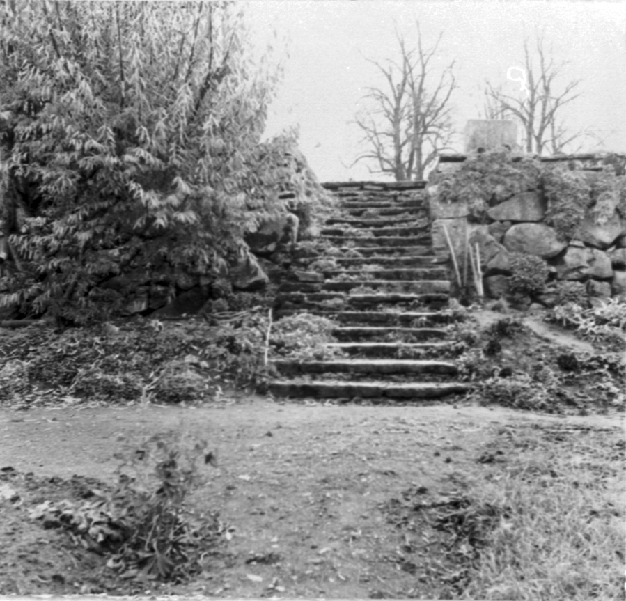 Västra bostadsflygeln. Södra gaveln med trappan från trädgården upp till gårdsplanen.