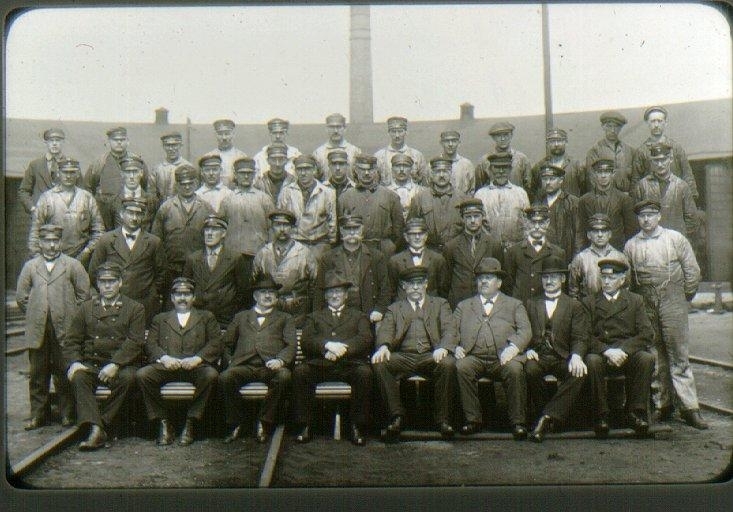 SJ:s personal vid lokstallarna före omläggningen till elektrisk drift. I början av 1920-talet. Uppifrån och från vänster: Rad 1: 1. eldare K. Skytt, 2. maskinskötare. K. Johansson, 3. v.o.st.k. Lindstedt, 4. v.o.st.k. Augustsson, 5. lokrep.K. Wallin, 6. lokrep, nu i Göteborg, 7. v.o. st.k. nu i Nässjö, 8. e.eld.Andersson, 9. svarv. Holmer, nu i Göteborg, 10. pannsköt. Sv. Kroon, 11. e.v.o.st.k. Jansson, 12. v.och st.k. Jansson. Rad 2: 1. v.o.st.k .Fransson, 2. lokeld. A.Bergström 3. lokrep.Lundahl, 4. lokrep. Frigell, 5. v.o.st.k. Engström, 6. v.o.st.k. S. Bergqvist, 7. lokrep. Lundin, 8.lokrep. Jönsson, nu i Elmhult, 9.v.o.st.k. K. Öberg 10. lokrep. Jönsson, nu i Nässjö, 11. eld. Ekengren, 12. lokrep. Ljungman, 13. m.o.pannsköt. Eriksson, 15. v.o.st.k. Daag. Rad 3: 1.v.o.st.k. Sjösten, 2.Lokeld. A.Nilsson, 3. lokf. A.Th. Brandt, 4.lokrep. A. Ruud, 5.lokrep. Blomén, 6. lokeld. Olsson, 7. lokeld. Nordenstam, 8.v.o.st.k. Sjöblom, 9. lokrep. H.Bengtsson, 10. lokrep. Svensso