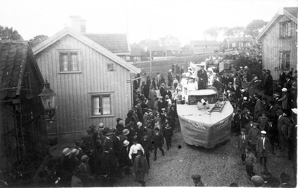 Karneval omkring 1925. Storgatan, karnevalståg från Hästbacken. Till höger spannmålshandlare Gustavssons. Till vänster repslagare Johanssons på Hästbacken 4.