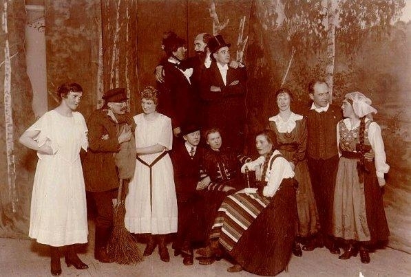 Cabaré å "Enigheten" (Falköpings Teater) 1919 till förmån för stadens fattiga. Behållningen av flera föreställningar i följd utdelades vid juletiden samma år. Personer från vänster övre raden: Knut Persson, lokreparatör (1933 bosatt i Örebro), Erik Flodin, biträde i Rosells färghandel, och John Sahlgren, sedermera en tid möbelhandlare här. Undre raden: fröken Tullie Johansson, sen gift m.Knut Karlsson, Kalkkontoret, A.E. Pehrsson, övermontör vid Falköpings Elektriska AB, fröken Alice Sahlgren, senare gift med stat.skriv. T. Gustafsson, Ranten, fröken Dagmar Persson, senare gift med lokreparatör Knut Persson, fröken Greta Sahlgren, tandtekniker i folkskolans tandvård, fröken Karin Spångberg, fröken Friberg, senare gift, lokeldare Konr. Gustafsson och hans fru Willy, född Berggren.