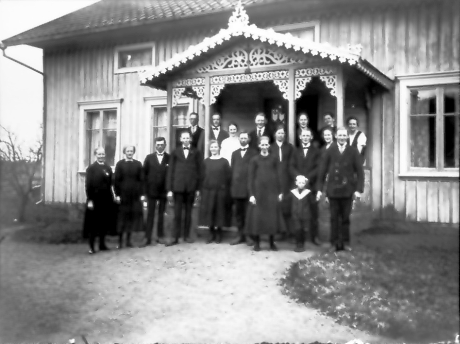 Bryngelsgården. Hulda Wilhelmina Johansson, Elsa Lidholm, Erik Lidholm, Nils Georg Johansson, Elin i Gårestorp, Gustav Nilsson, Hanna Emilia gift Andersson, Anna Andersson, Amandus Andersson, okänd, Oskar Andesson och lille Arne född 1921. Bakre raden Helge Setterberg, Hjalmar ?, Signe i gårestorp, Sven Andersson, Anna Andersson, Augusta Lundqvist, Ester Maria Johansson.