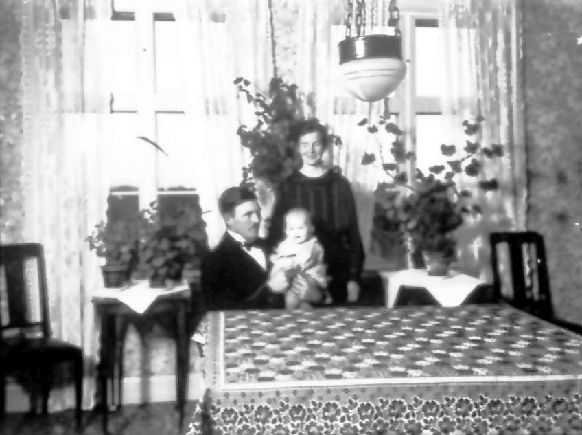 Karl Jonsson (sågarn) i Gisslared med hustru Gerda och dottern Karin född 1924. På andra våningen i den s.k. Frälsegården.
