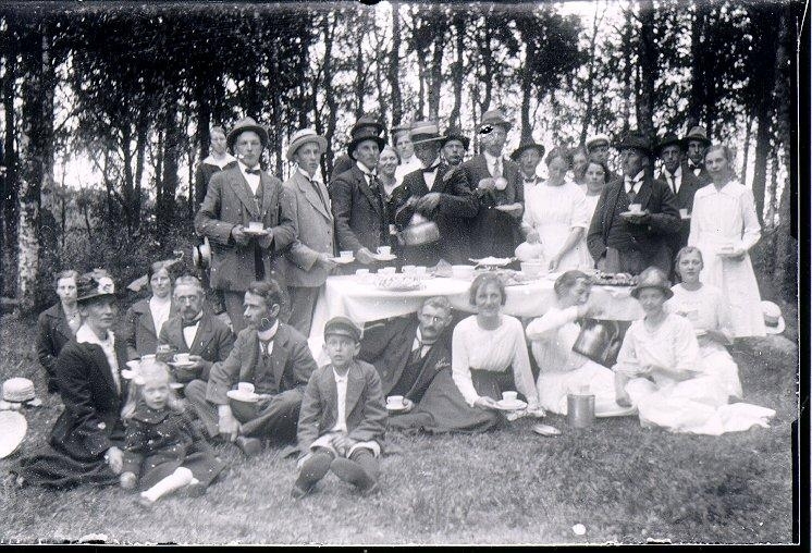 Gökotta i "Guds Gröna Lund" på Tyskagården Näs, med folk från Yllestad, Vistorp och Näs. Längst fram till vänster sitter skräddaren Gustaf Hallgren med hustru och två barn. Under bordet: Gustav Hult. År: omkring 1920. Foto Johan M. Johansson, Berga Kättilstorp.