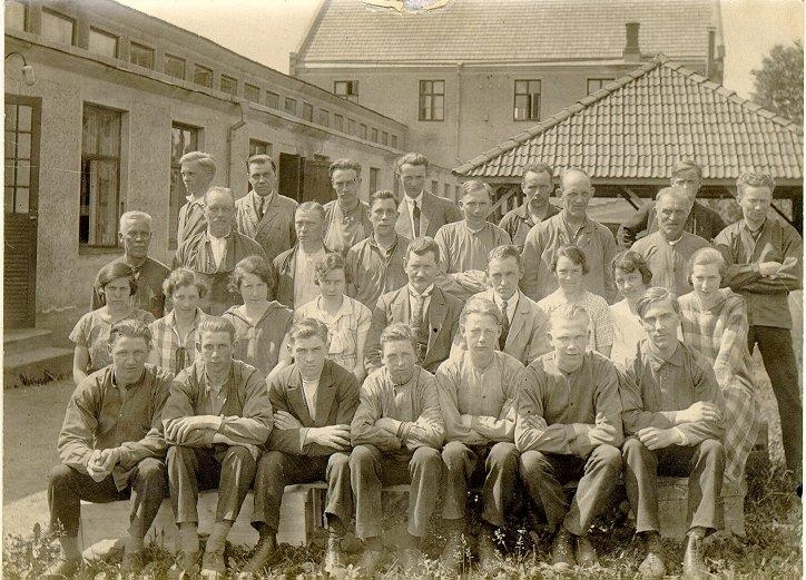 Firma AB Aristo. Personal och chefen Gustafsson vid Reseffektfabriken "Aristo" omkring 1926. Övre raden stående från vänster: Sven Johansson, Oskar Ekström, Hilding Karlsson, Sven Johansson och Eugén Jansson. Andra raden stående: A.W. Nylén, W.B. Roos, Sven Plith, Gunnar Blom, Erik Persson, Oskar W. Johansson, Karl Johansson och Arvid Blom. Tredje raden sittande: Margit Eriksson, Sigrid Lundin, Anna-Lisa Westberg, Karin Widell, Oskar Gustafsson (chefen, död 1938), Helge Johansson, Anna Blom, Elsa Fredriksson och Anna-Kajs Plith. Fjärde raden sittande: Nils Fredriksson, Karl Källén, Gusten Jansson, Knut Klasson, Harry Lundberg, Nils Persson, Erik Kjellman.
