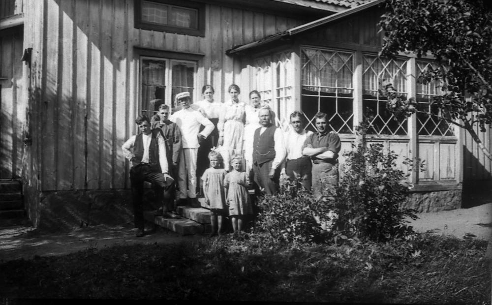 Krabbagården. Främst barnen Alva och Ella Lundkvist. Fr.v. 2 okända, kocken på Rikskabeln, 2 okända, Augusta och Johan Lundkvist, 2 okända.
