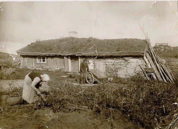 Gammal stuga med torvtak i Högstena. Okt. 1913. August Brandt. Potatisupptagning hos "lumpsamlarn".