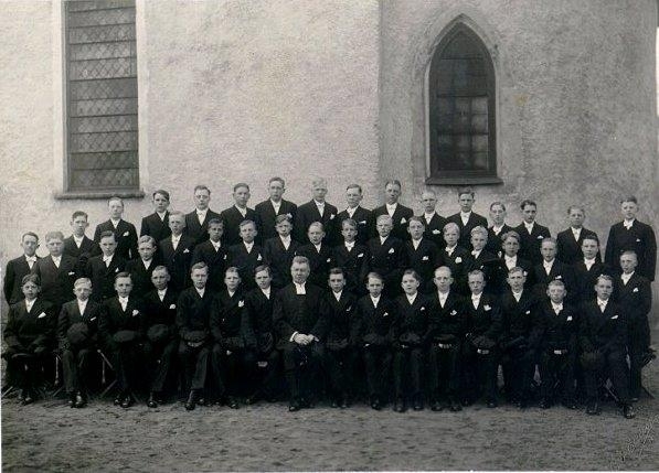 Konfirmander 1932?. Nedre raden från vänster: 3. B.Nygren, 4. Jacobsson, 6. Larsson, 8. prosten Wetterholm, 9. Wallin, 12. Karlsson, 13. Johansson (lille Kicki), 14. S. Johansson, 15. Andersson (Agståt). Andra raden: 4. E. Nilsson, 6. Zem Larsson, 8. Olsson, 10. Johansson, 16. Davidsson, 17. S. Sterner. Tredje raden: 1. O. Karlsson, 3. H. Ferm, 4. Johansson (store Kicki ), 7. Ljungström, 8. A. Johansson - Sköldsvik, 10. Sand, 13. Jonsson, 14. Johansson (Jim - Jim). Anm. Många var från socknar utanför staden, varför besvärligt med namnen.