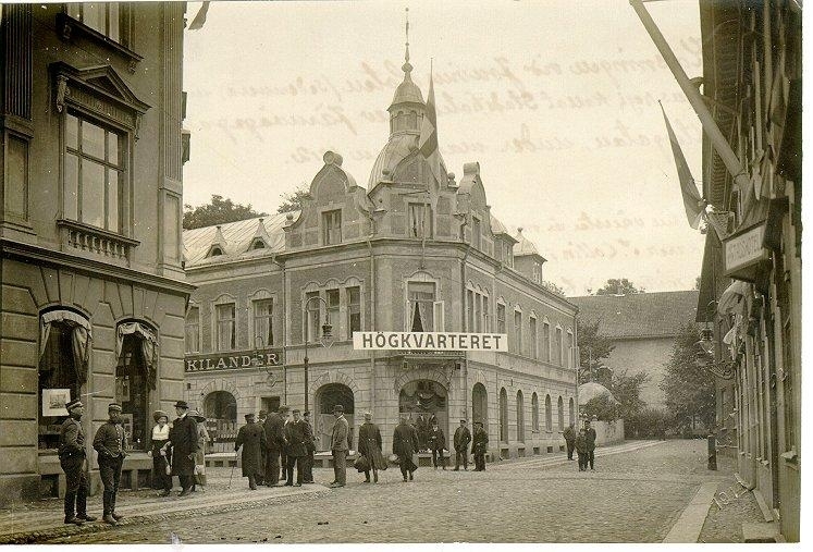 Från fältmanövern 1912. Korsningen vid Jouvins hotell (sedermera under källarmästare Bergmans regi,kallat Stadshotellet) av Järnvägsgatan /Ranta-vägen (numera S:t Olofsgatan) och Storgatan, under manövern 1912. Paret t.v. är marinintendent Collberg med fru, dotter till provinsialläkaren S.Collin i Falköping. Den i mitten av de tre under 1:a E-et i skylten Högkvarteret är arb. Flood. Mannen bakom den lilla pojken till höger är gatuförman Helmér.