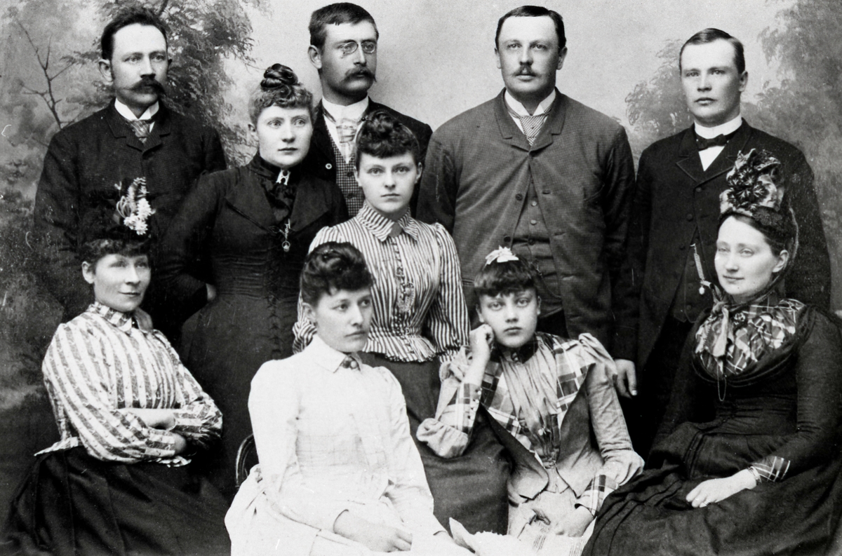 Övre raden fr. v: bagare Adolf Cederlund, bankkassör Ander, C.H. Gustafsson, den fjärde okänd (möjligen Sigurd Johansson). Damer, mellersta raden: damen i svart okänd, fröken Hilma Skoglund i randig blus, syster till C.H. Gustafssons svärmoder. Nedre raden: fru Augusta Cederlund, fröken Olga Svensson (gift Lundström), fru Hillevi Gustafsson, fru Axelina Johansson (mor till fru Hillevi Gustafsson).