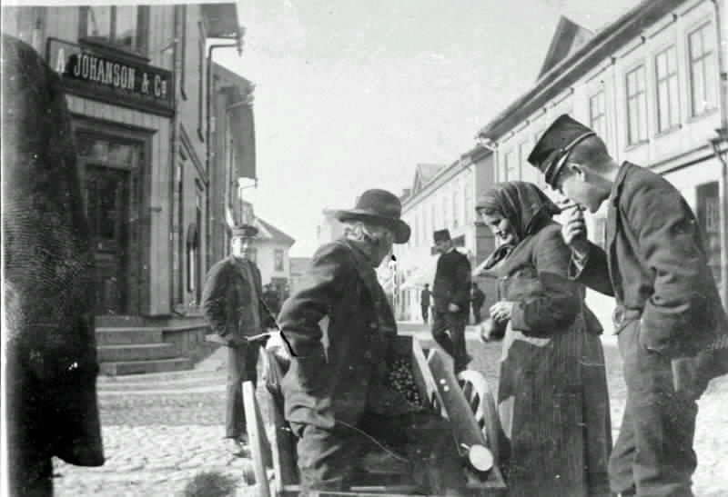 Titel: Stora torget. Gamle Anders, Anders Ringstedt ("Ull-Anners", död omkring 1910) säljer äpplen på stadens torg. Fru Anna Grenander född Rosander ("Satta") är spekulant på kvastarna, liksom en f.d. beväring i egen mössa tydligen vill köpa äpplen. Foto från omkring 1900 i hörnet av torget mot Storgatan.