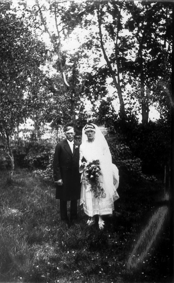 Brudparet Linus Mattsson, Anders Nilsgården Ässtorp och Märta Andersson, Stommen Göteve. Vigda av Klas Lindhom 11/6 1922.
