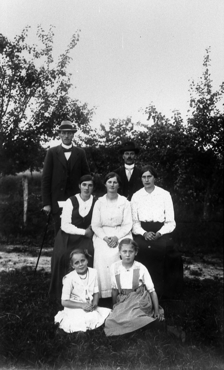 Ledsgården. Stående Oskar och Klas. Sittande Natalia Johansson Ölstorp, Berta Andersson Ledsgården, Ester Svensson gift med Verner Andersson Vadsbo. Flickorna okända.